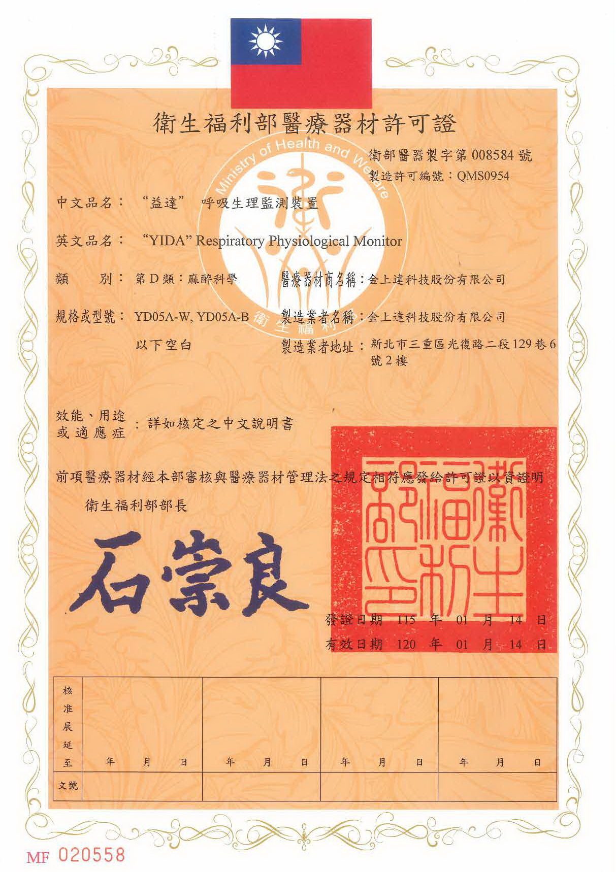 中文品名:"益達"呼吸生理監測裝置